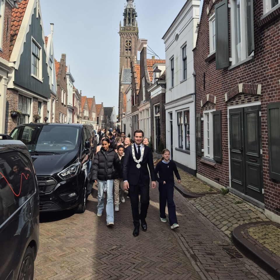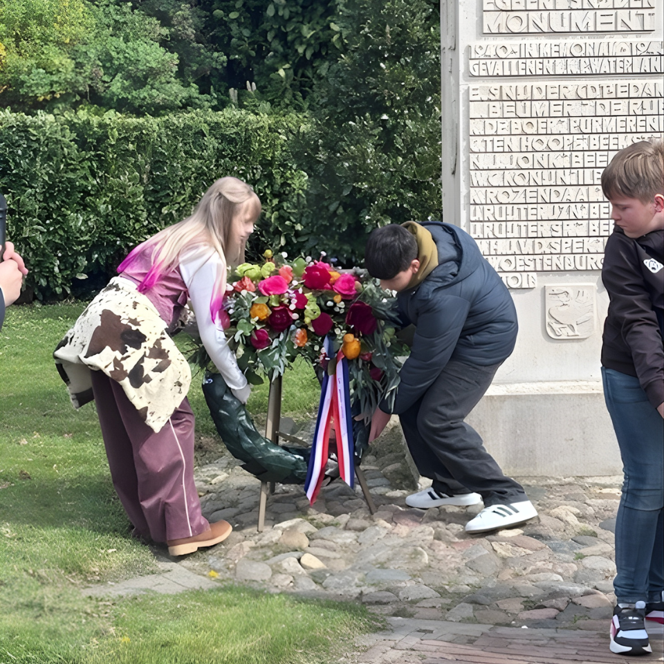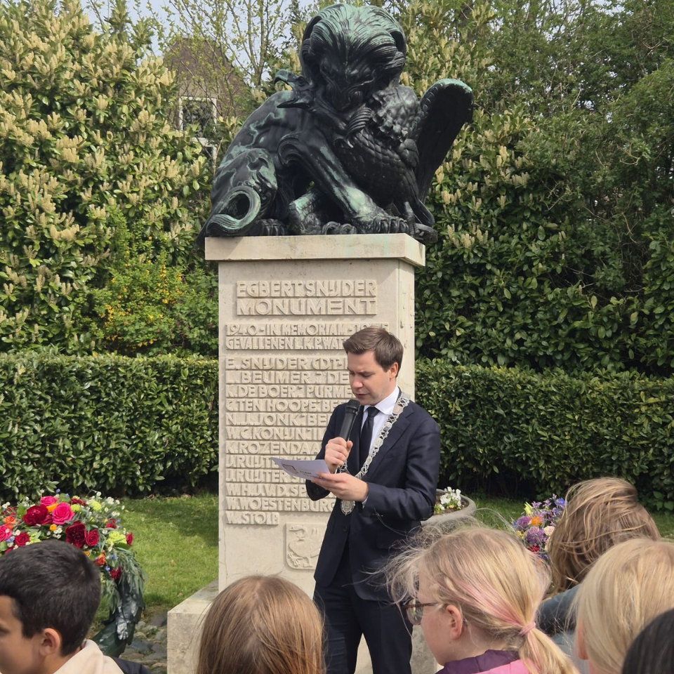 Vandaag stond burgemeester Rick Beukers samen met leerlingen en leerkrachten van De Trimaran en De Nieuwe School stil bij vrijheid en herdenken. Voorafgaand aan de bijeenkomst bij het Egbert Snijder Monument sprak hij met de leerlingen over vrijheid, uitsluiting en het belang van herdenken. Nu en in de toekomst. Daarna liepen de leerlingen vanaf het Damplein samen met de burgemeester naar het monument. Daar was een stiltemoment en lazen zij zelfgeschreven gedichten voor en legden zij kransen bij het monument. Vanwege de komende schoolvakantie vond de herdenking nu al plaats.