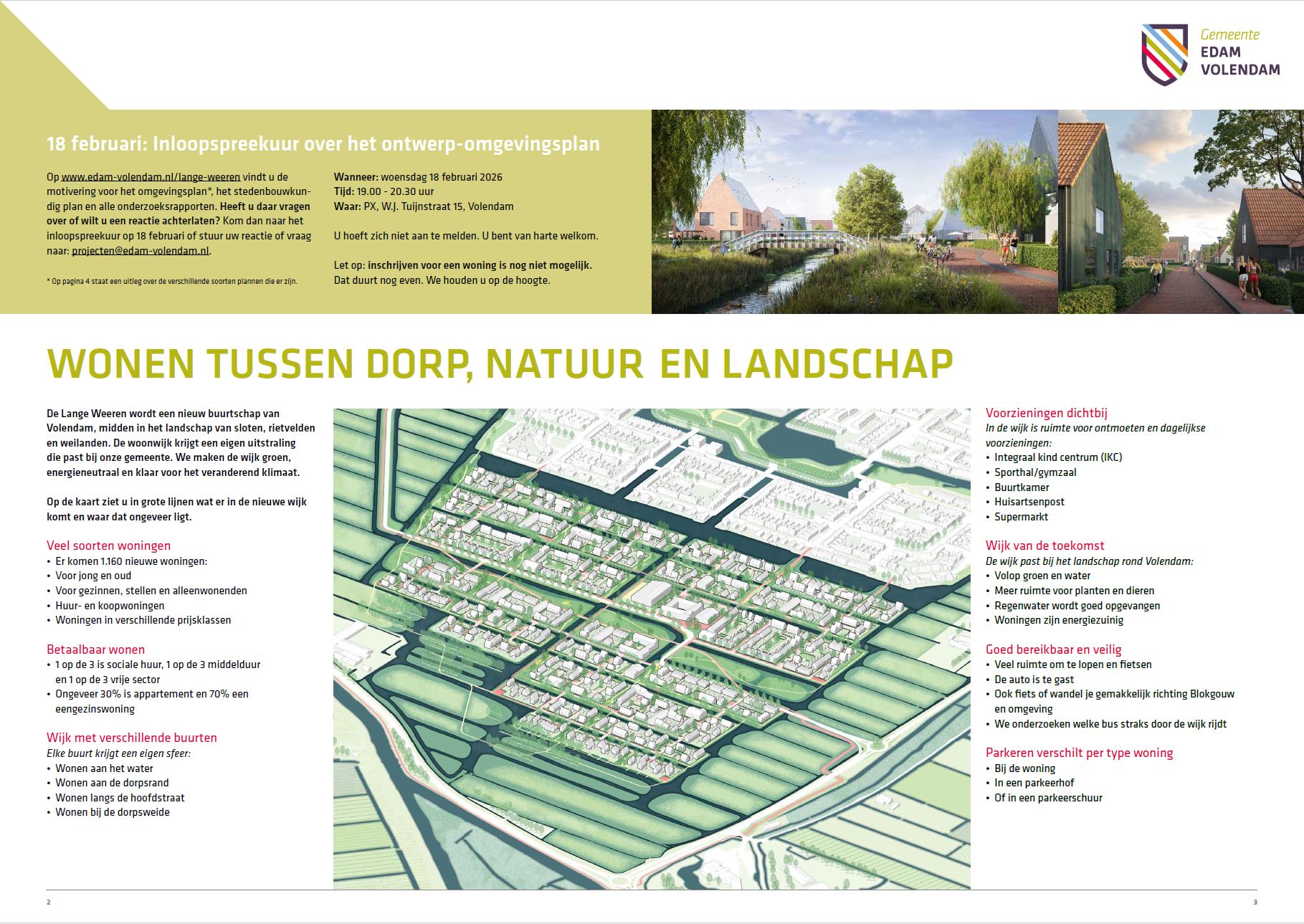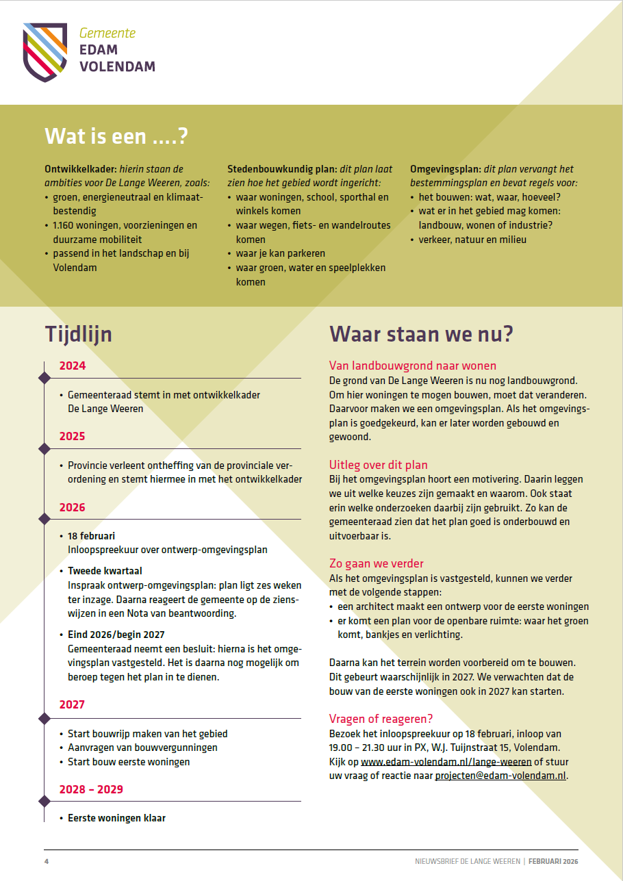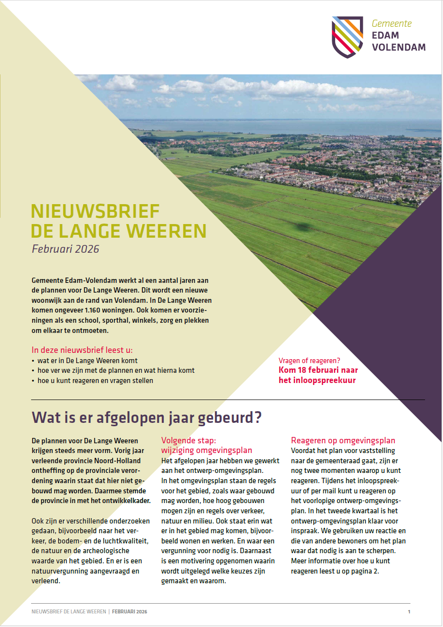 Wij werken al een aantal jaren aan de plannen voor De Lange Weeren. Dit wordt een nieuwe woonwijk aan de rand van Volendam. In De Lange Weeren komen ongeveer 1.160 woningen. Ook komen er voorzieningen als een school, sporthal, winkels, zorg en plekken om elkaar te ontmoeten. Hieronder vindt u documenten die horen bij dit project: